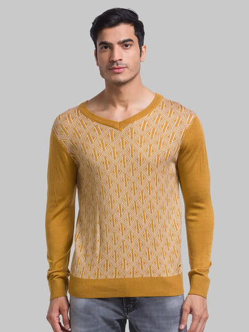 Parx Men Yellow Regular Fit Yarn Dyed Acrylic Full Sleeves V Neck Sweater