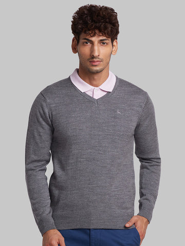Men Grey Solid Wool Blend Full Sleeve V Neck Collar Sweaters