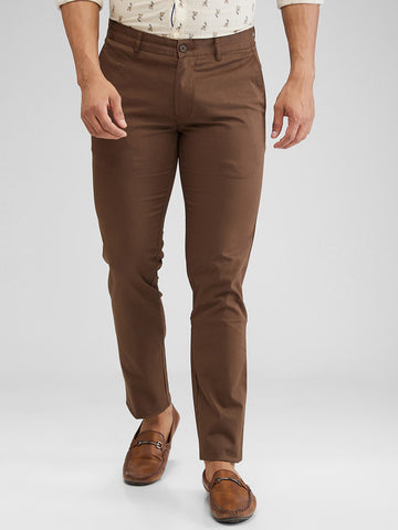 Parx Brown Solid Low Rise Tapered Fit Cotton Blend Trouser