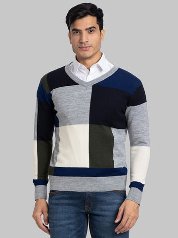 Men Blue Tailored Fit Jacquard Cotton Full Sleeve Round Collar Sweaters