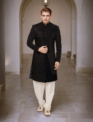Ethnix by Raymond Men Black Embroidery Regular fit Velvet Indowestern
