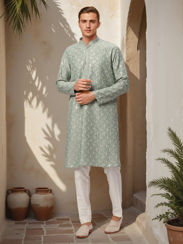 Ethnix by Raymond Men Green Embroidery Regular fit Polyster Blend Kurta
