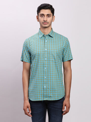 Colorplus Green Checks Tailored Fit Half Sleeve Cotton Shirt