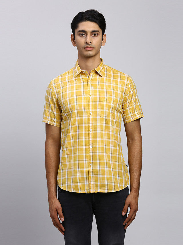 Parx Men Yellow Checkered Slim Fit Half Sleeve Semi Cut Away Collar Shirt