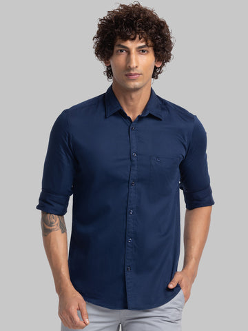 Parx Blue Solid Slim Fit Full Sleeve Cotton Blend Shirt