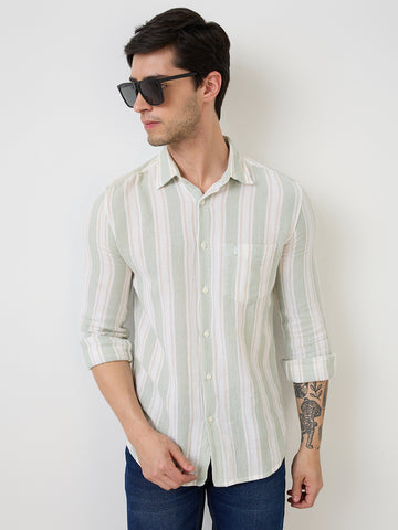 Parx Men Green Stripe Slim Fit Cotton Casual Shirt