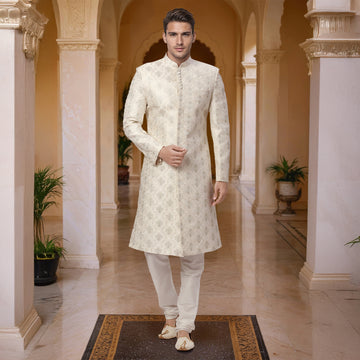 Ethnix Men White Embroidery Polyester Blend Sherwani