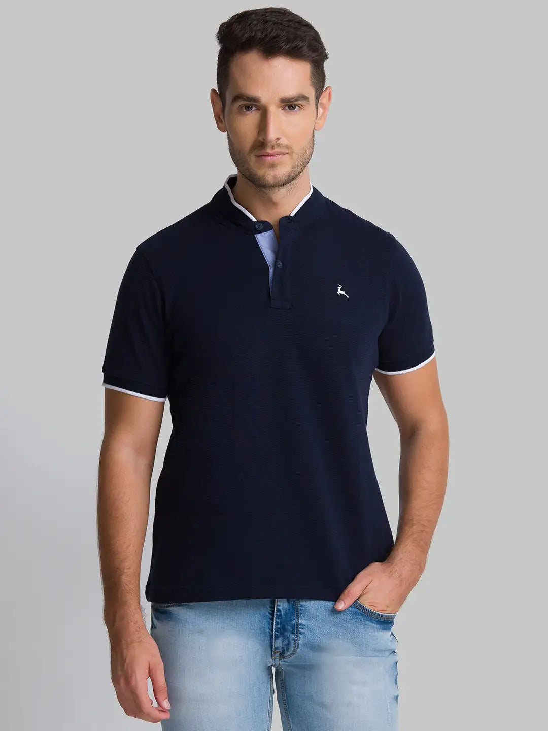 2. Men Blue Regular Fit Structure Cotton Henley Collar T-Shirt